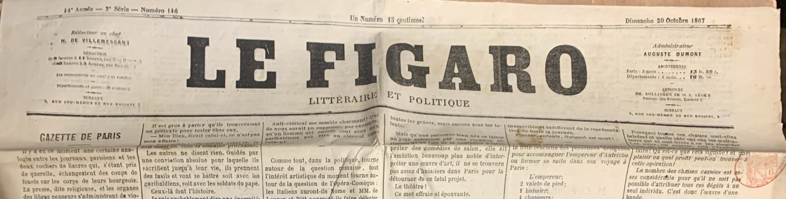 E / Journal Le Figaro du dimanche 20 octobre 1867 numéro 146 rédacteur en chef Hippolyte de Villemessant