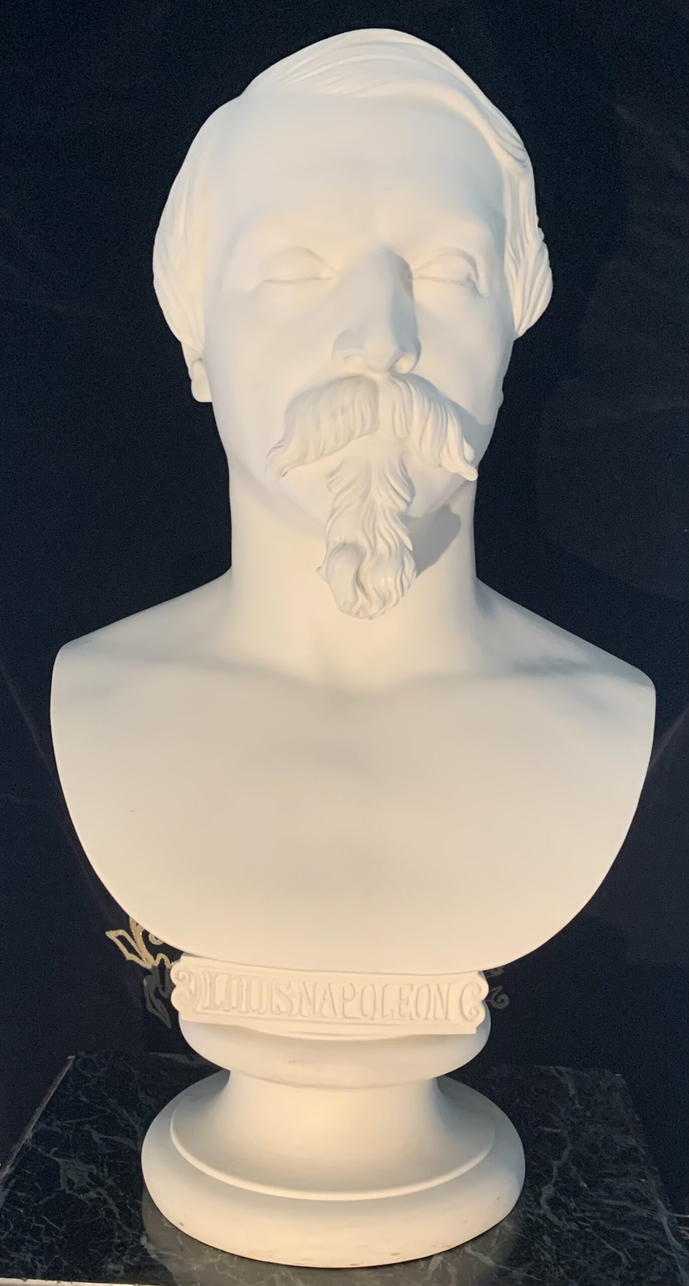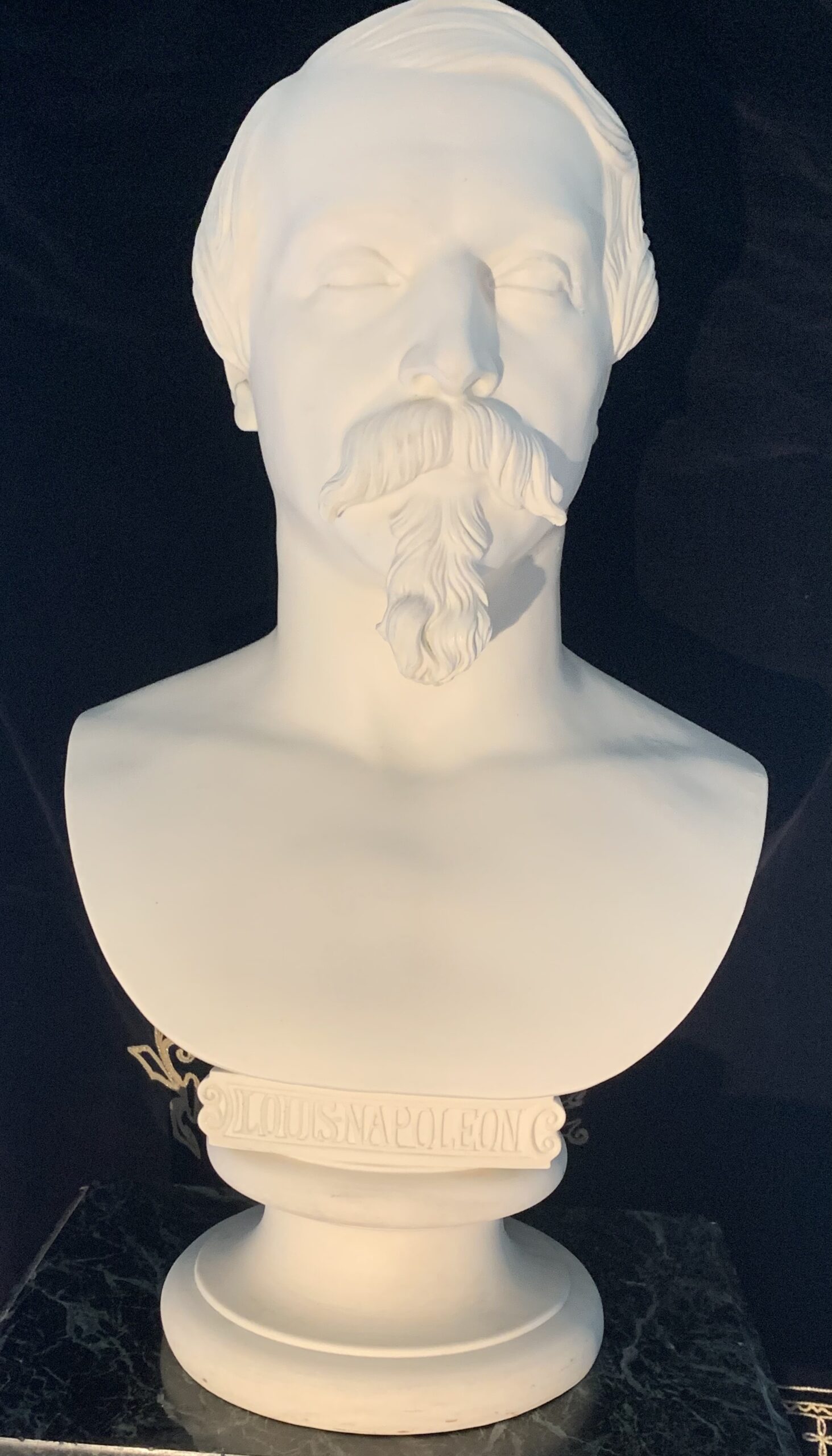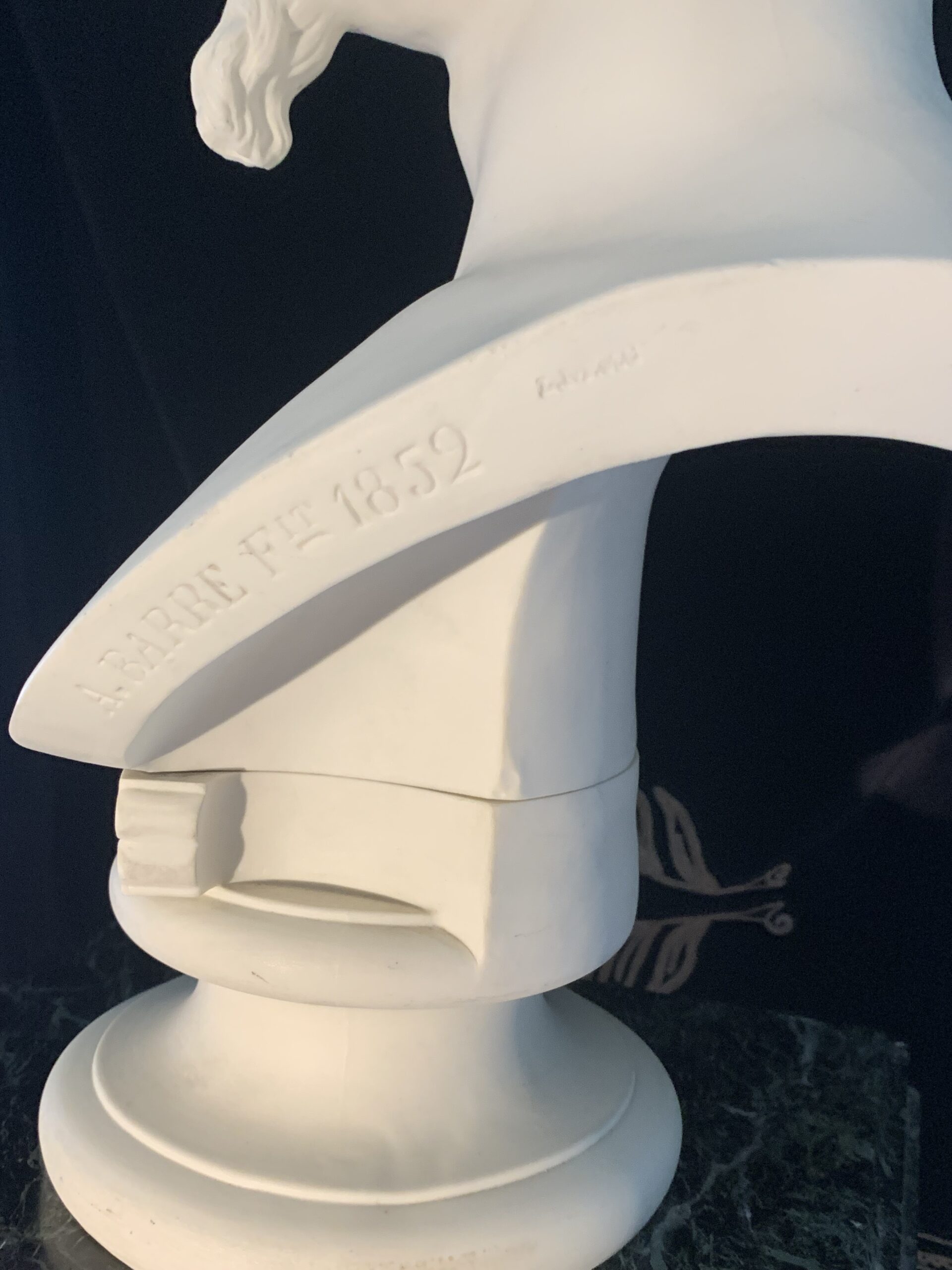 Louis Napoléon buste à l’antique sur piédouche en biscuit de Sèvres titré, signé et daté sur le coté droit A. BARRE Fit (Fecit= il l’a fait) 1852. Marque en creux .