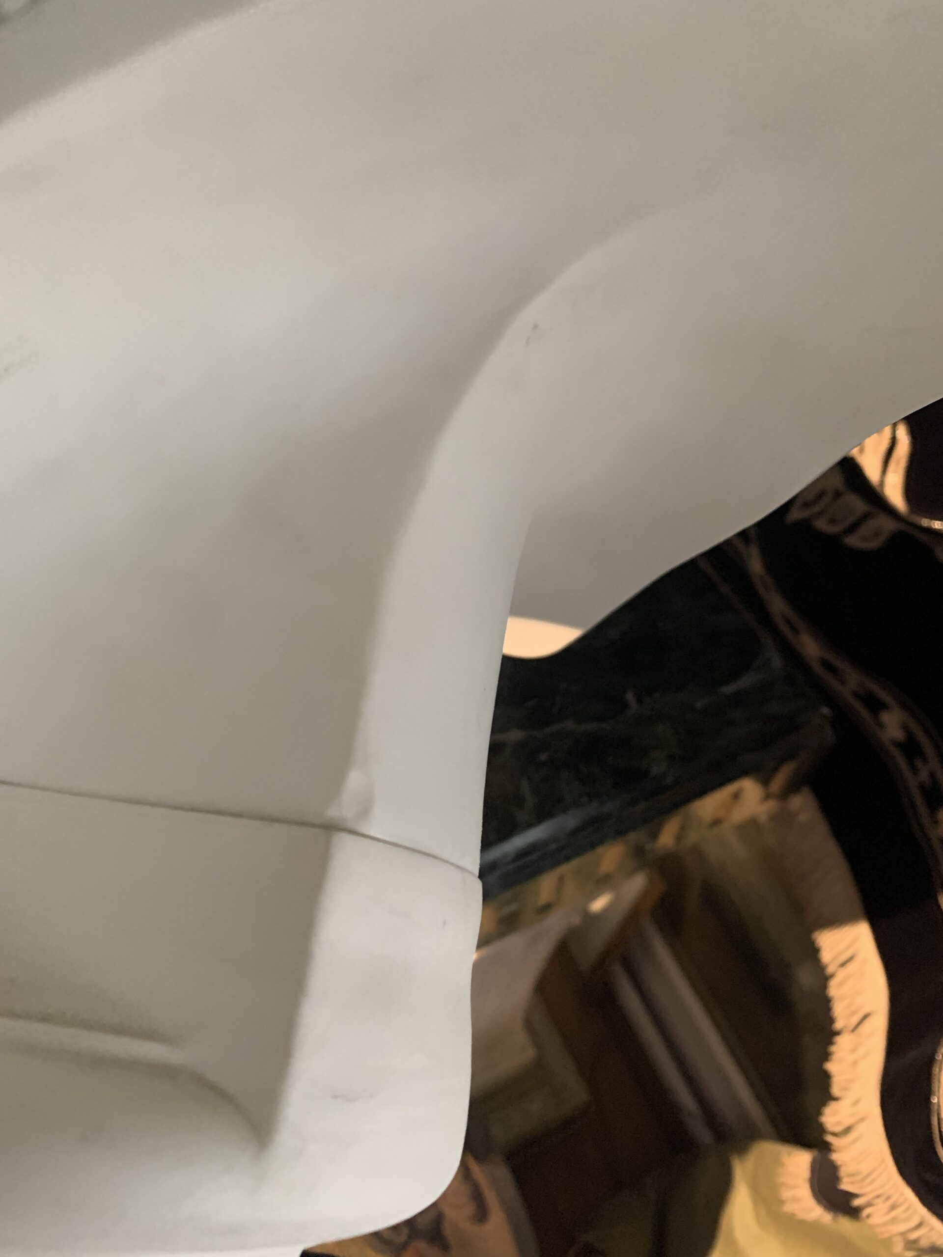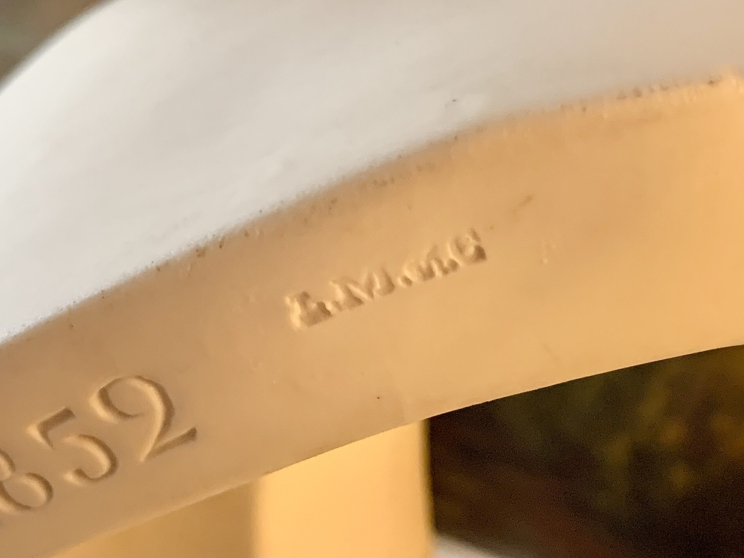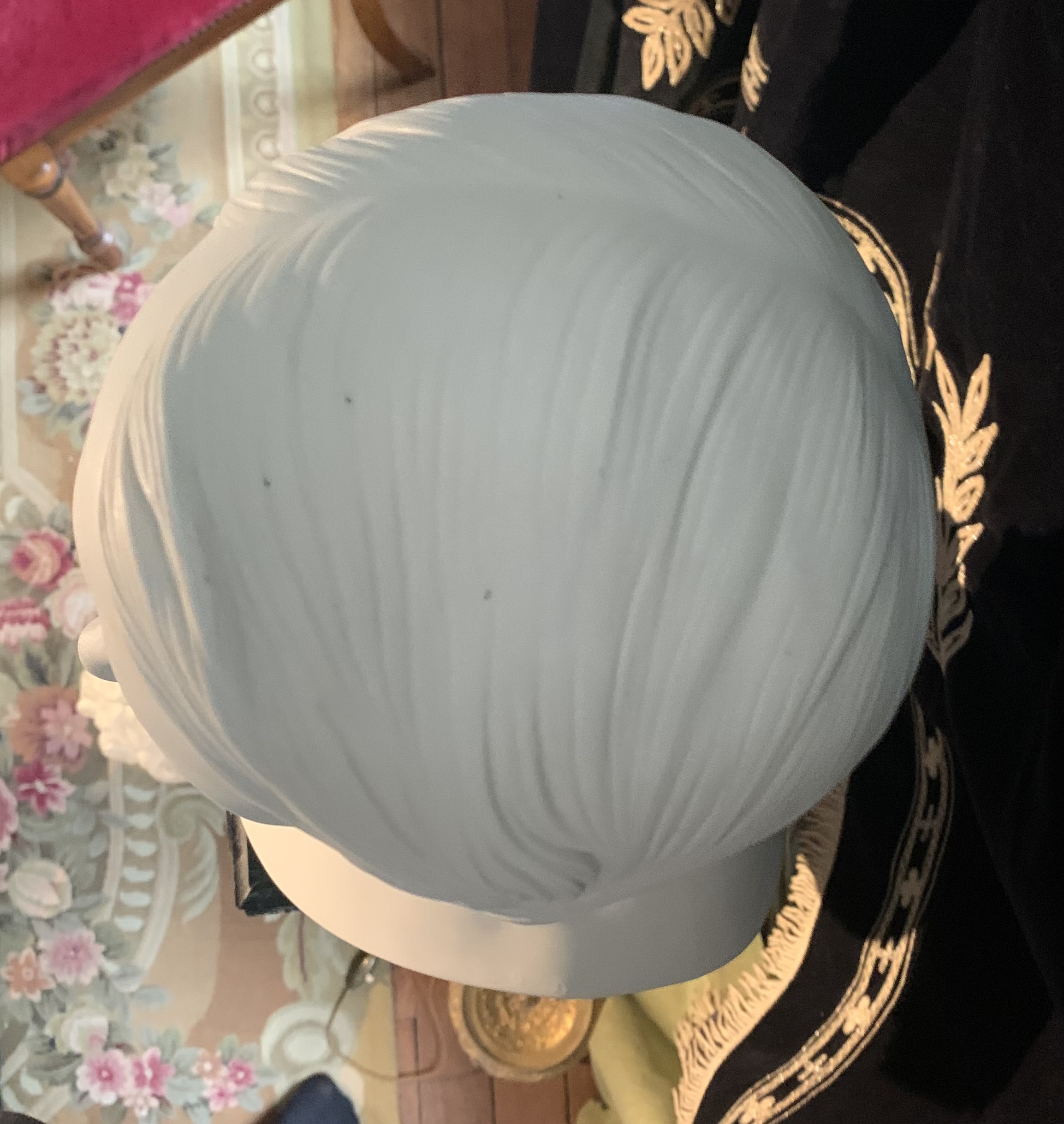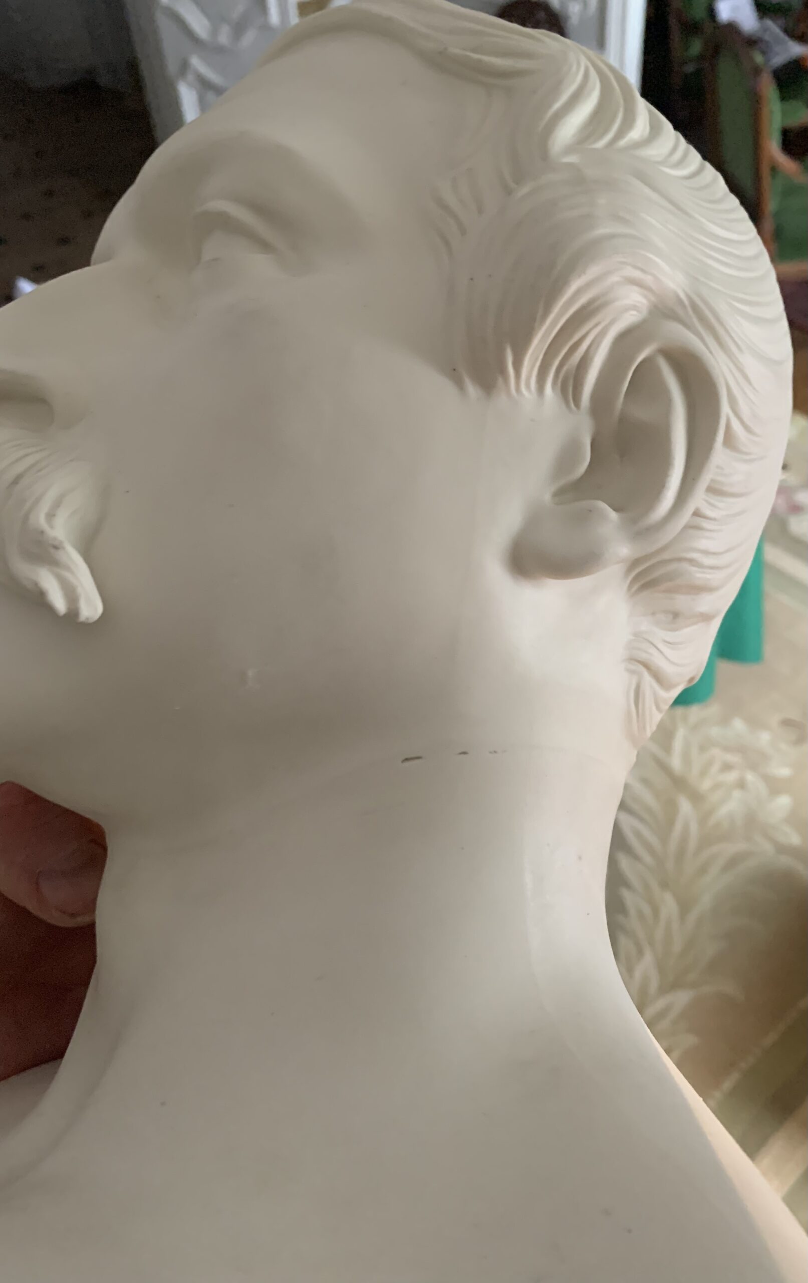 Bon état ; visage, moustache et barbiches impeccables, quelques légers fêles de cuisson base du cou, épaule, quelques égrenures éparses, quelques petits éclats sur la base arrière du buste, au niveau de l’angle inférieure et sur l’entourage du cartouche, salissures, .