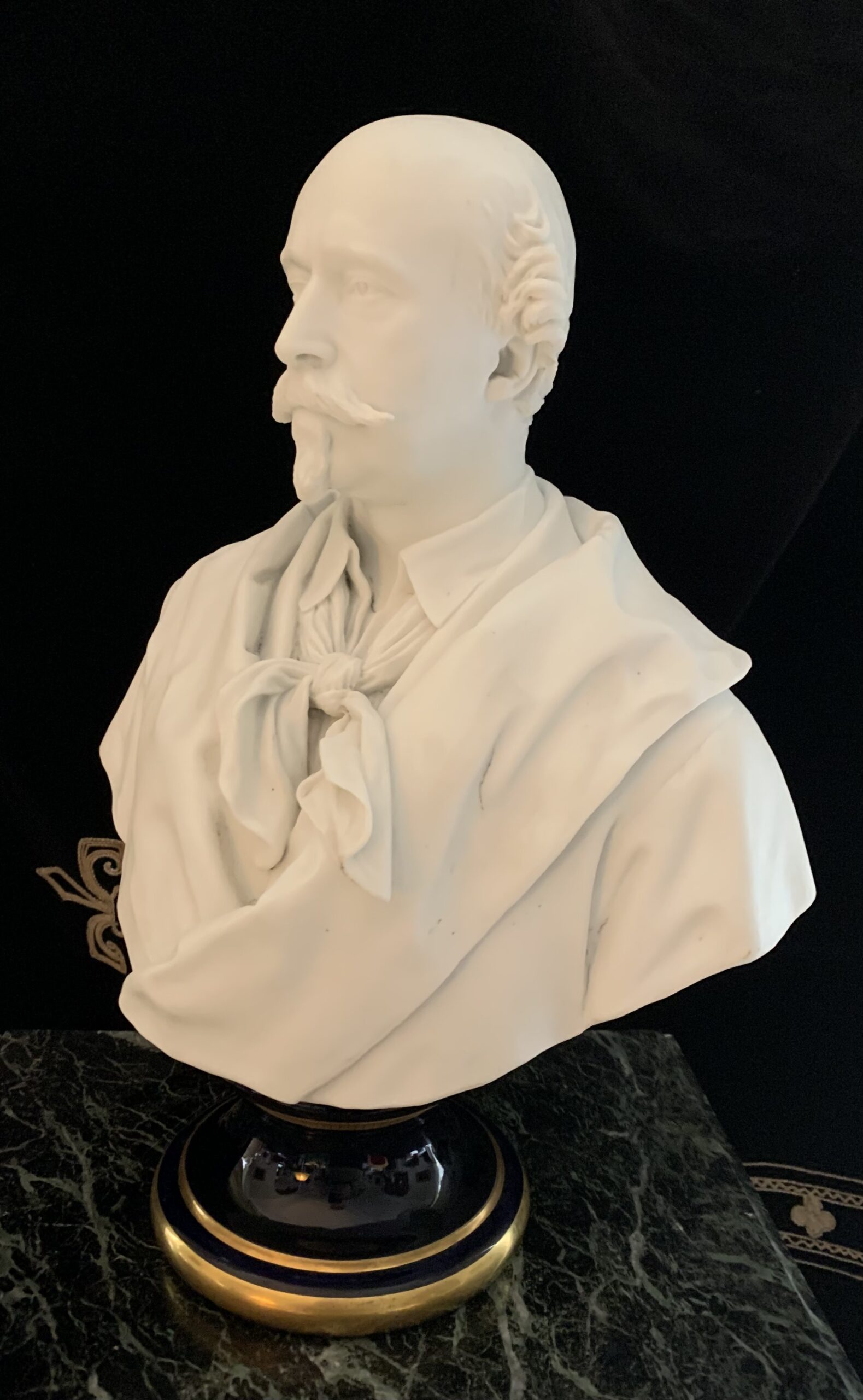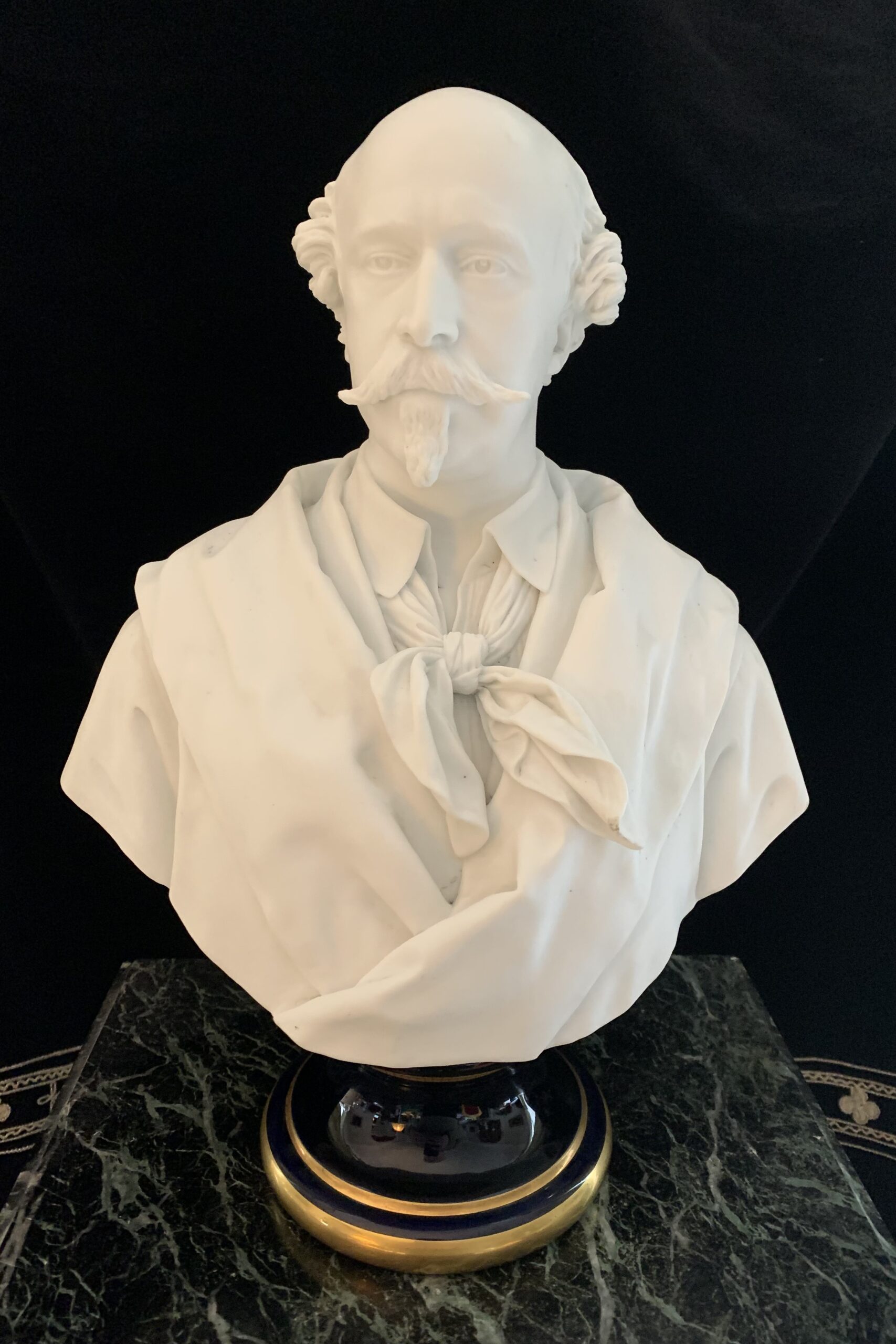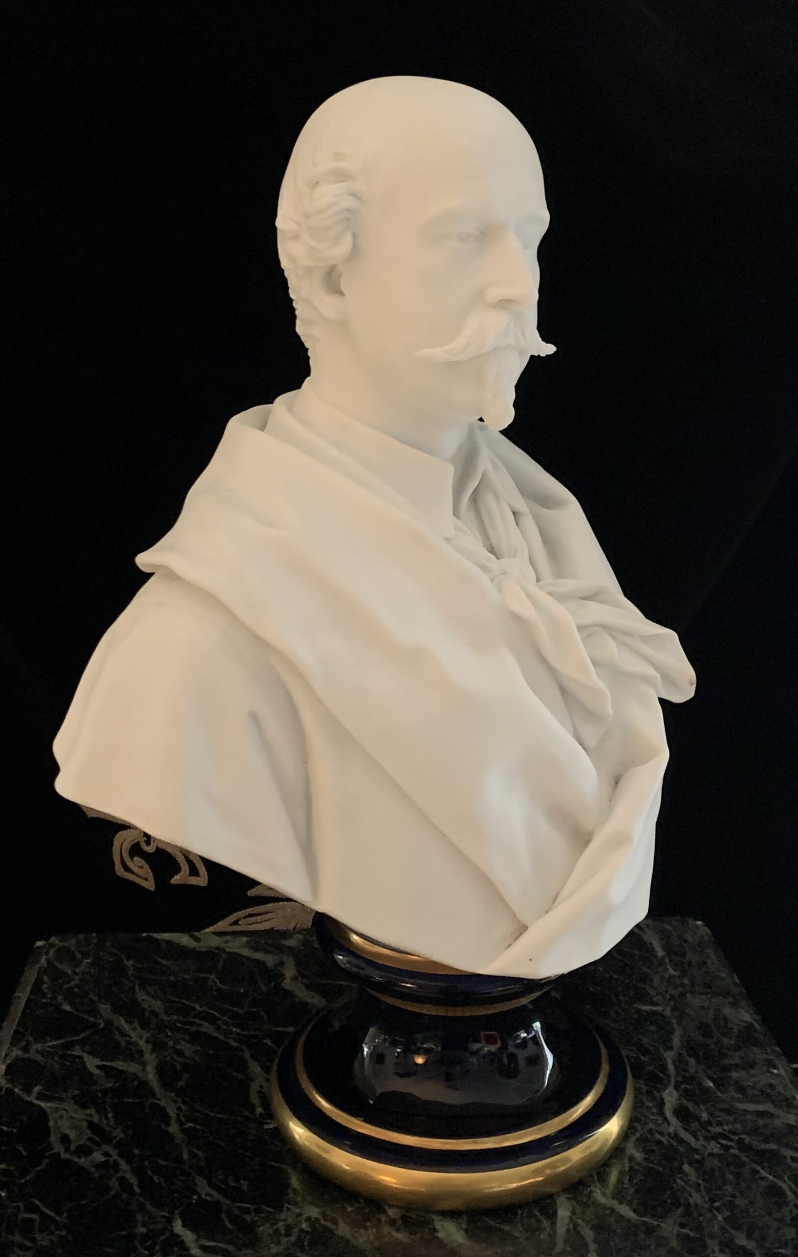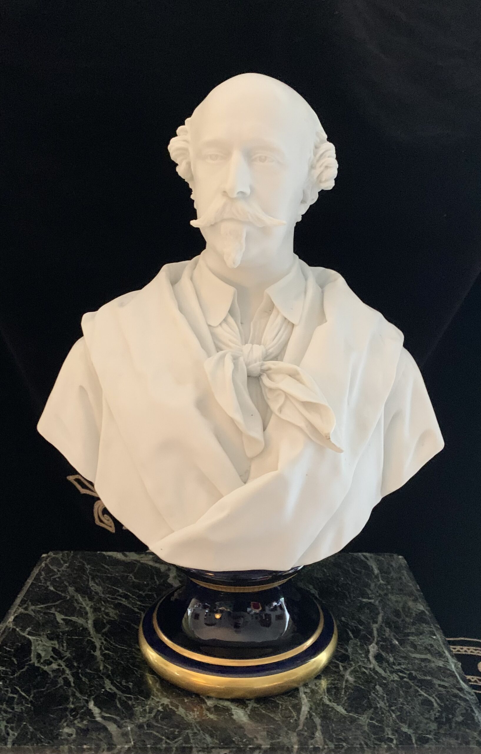 Très joli buste, en biscuit de porcelaine sur piédouche émaillé bleu représentant le Duc de Morny signé « Iselin 1865 ». Probable travail de la Manufacture de Sèvres portant sur le piédouche la marque «gille jne fabt» Marque en creux et pastille en biscuit bleu ciel monogrammé «JC»
