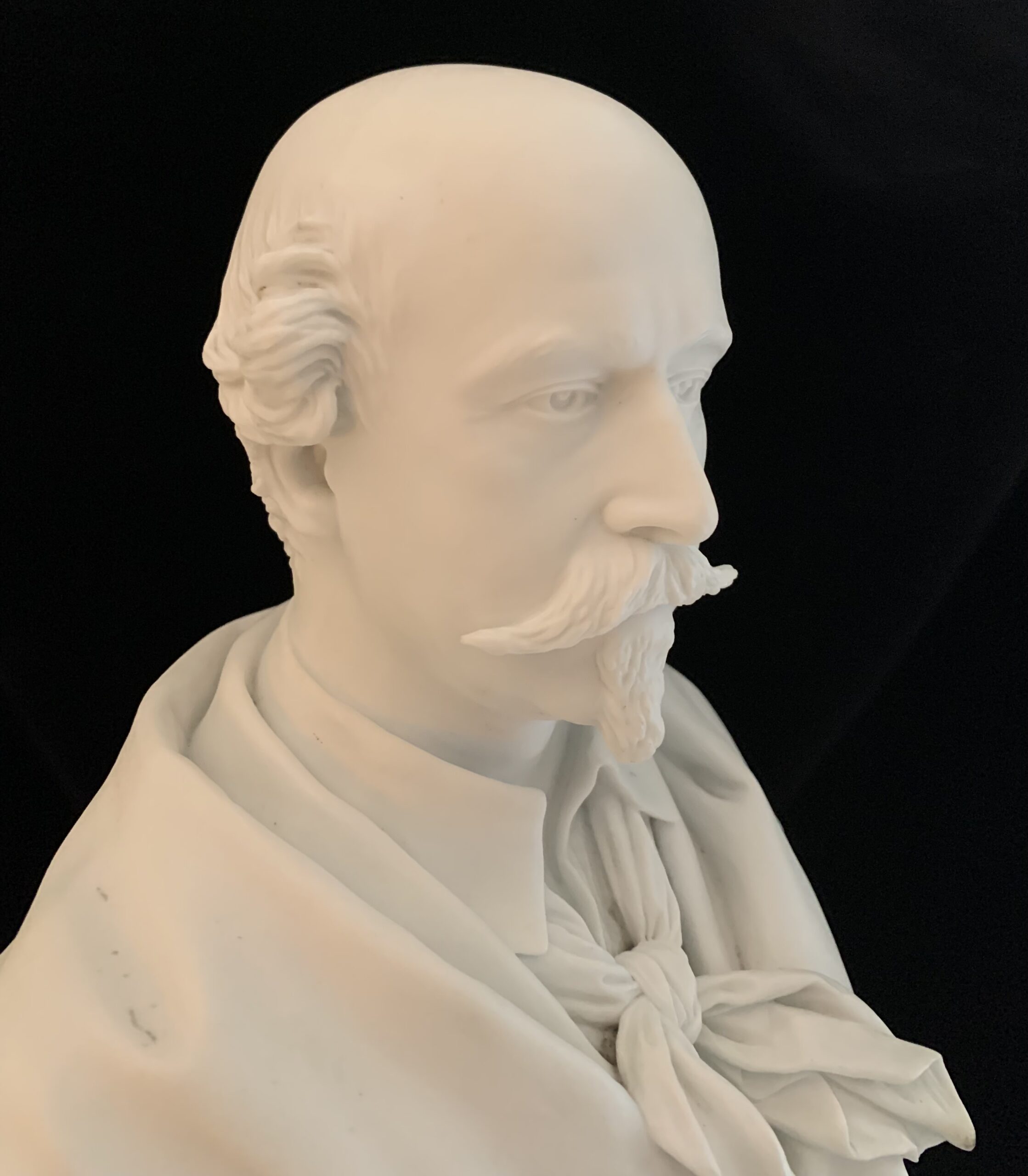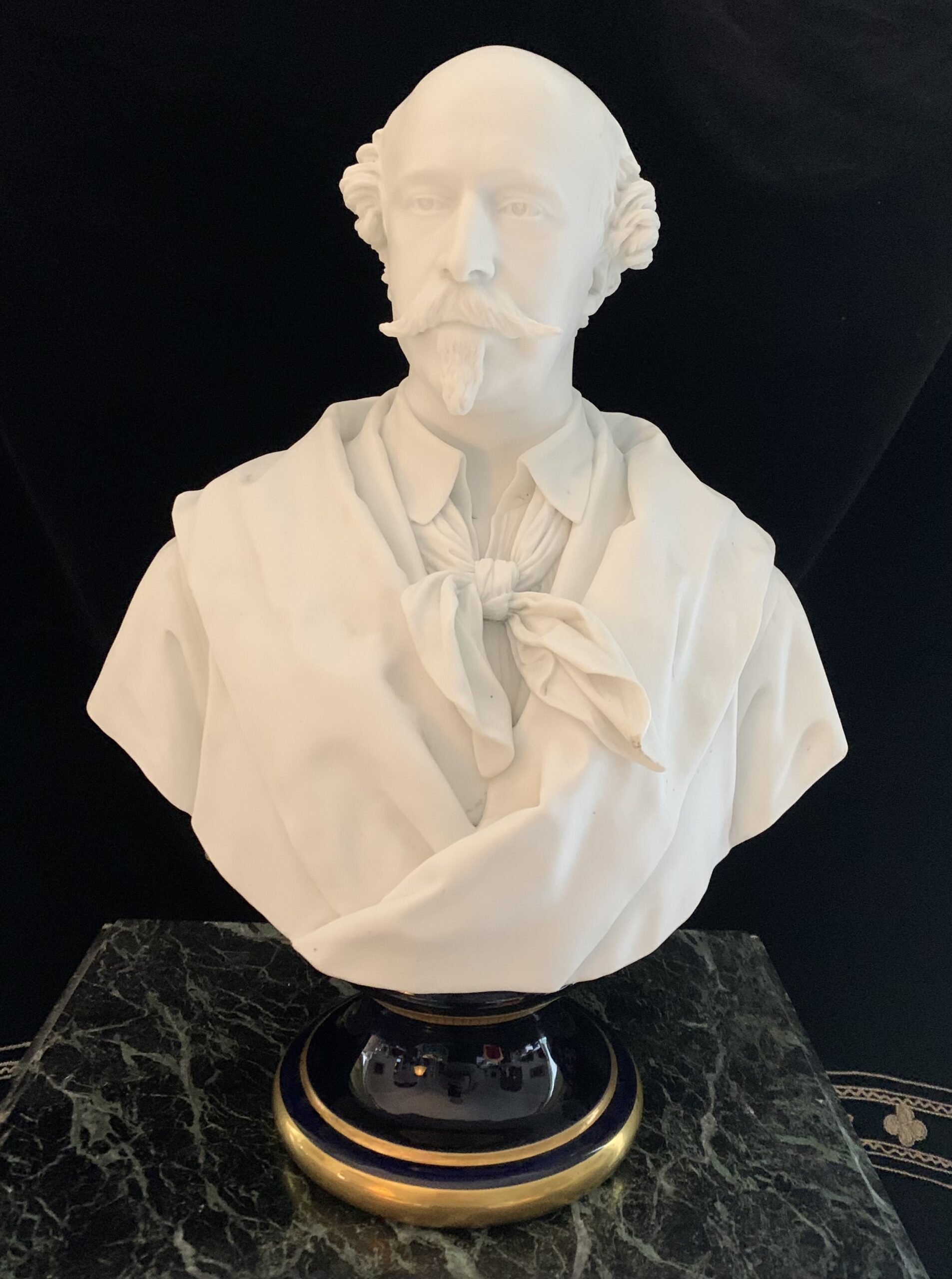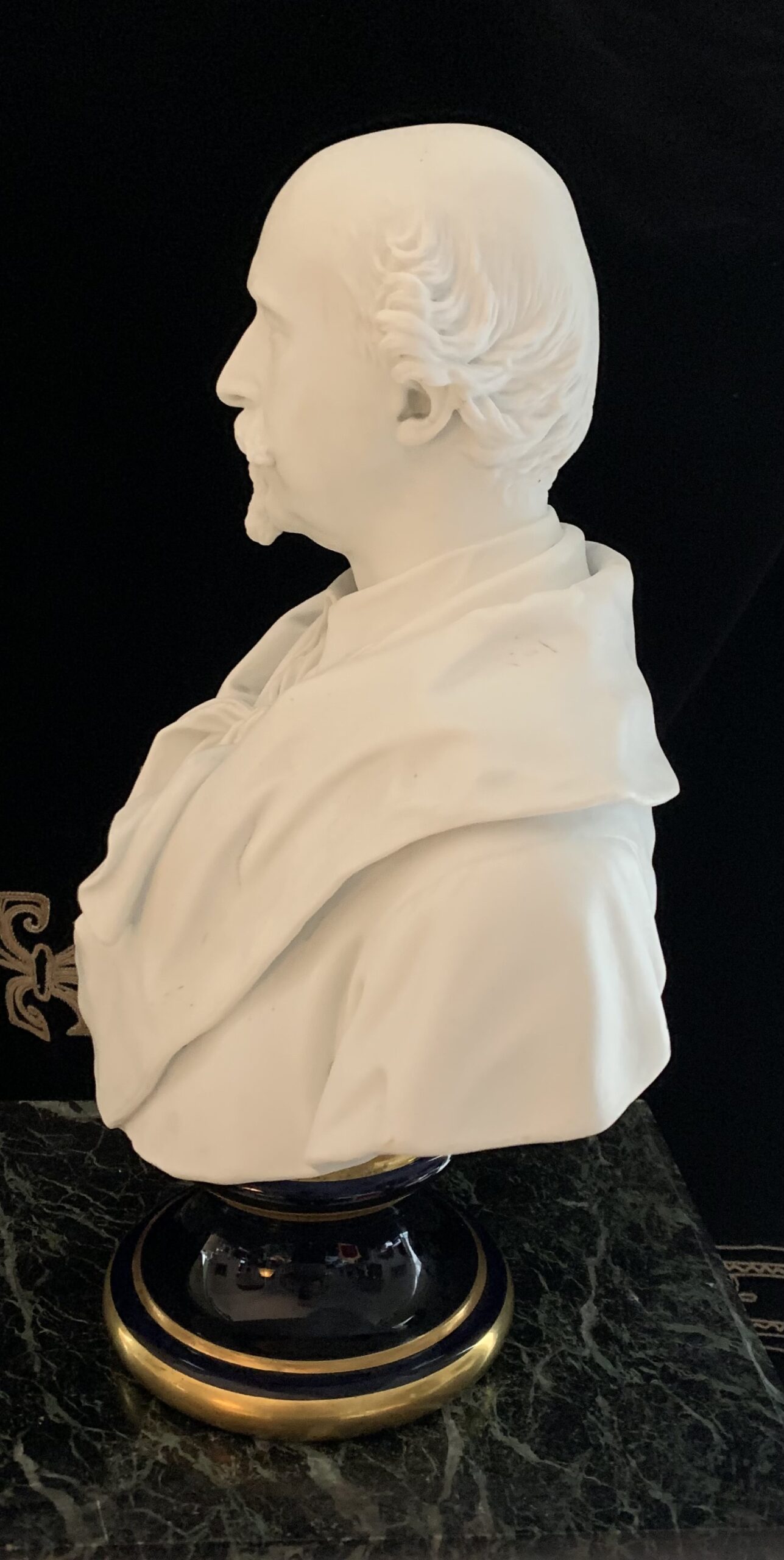 Très joli buste, en biscuit de porcelaine sur piédouche émaillé bleu représentant le Duc de Morny signé « Iselin 1865 ». Probable travail de la Manufacture de Sèvres portant sur le piédouche la marque «gille jne fabt» Marque en creux et pastille en biscuit bleu ciel monogrammé «JC»