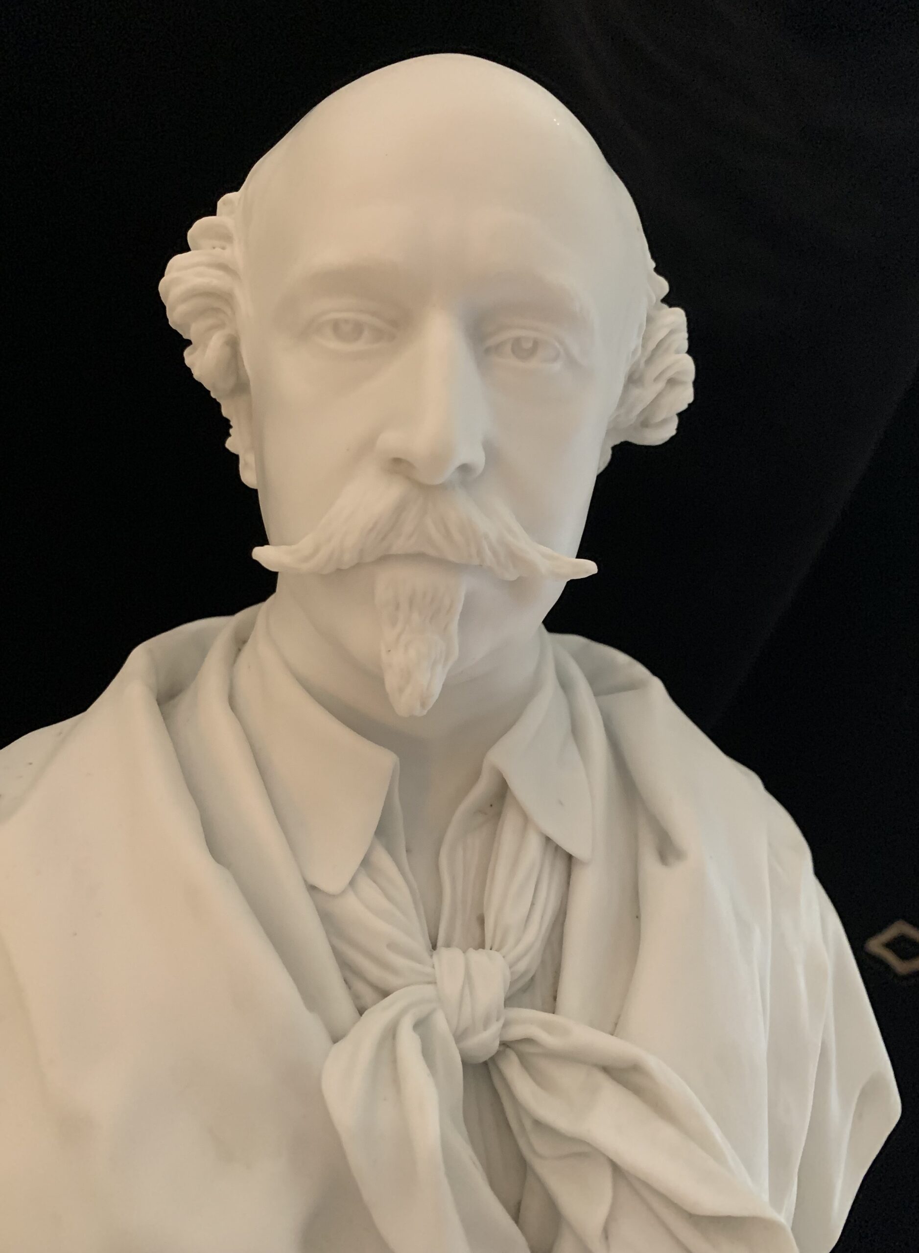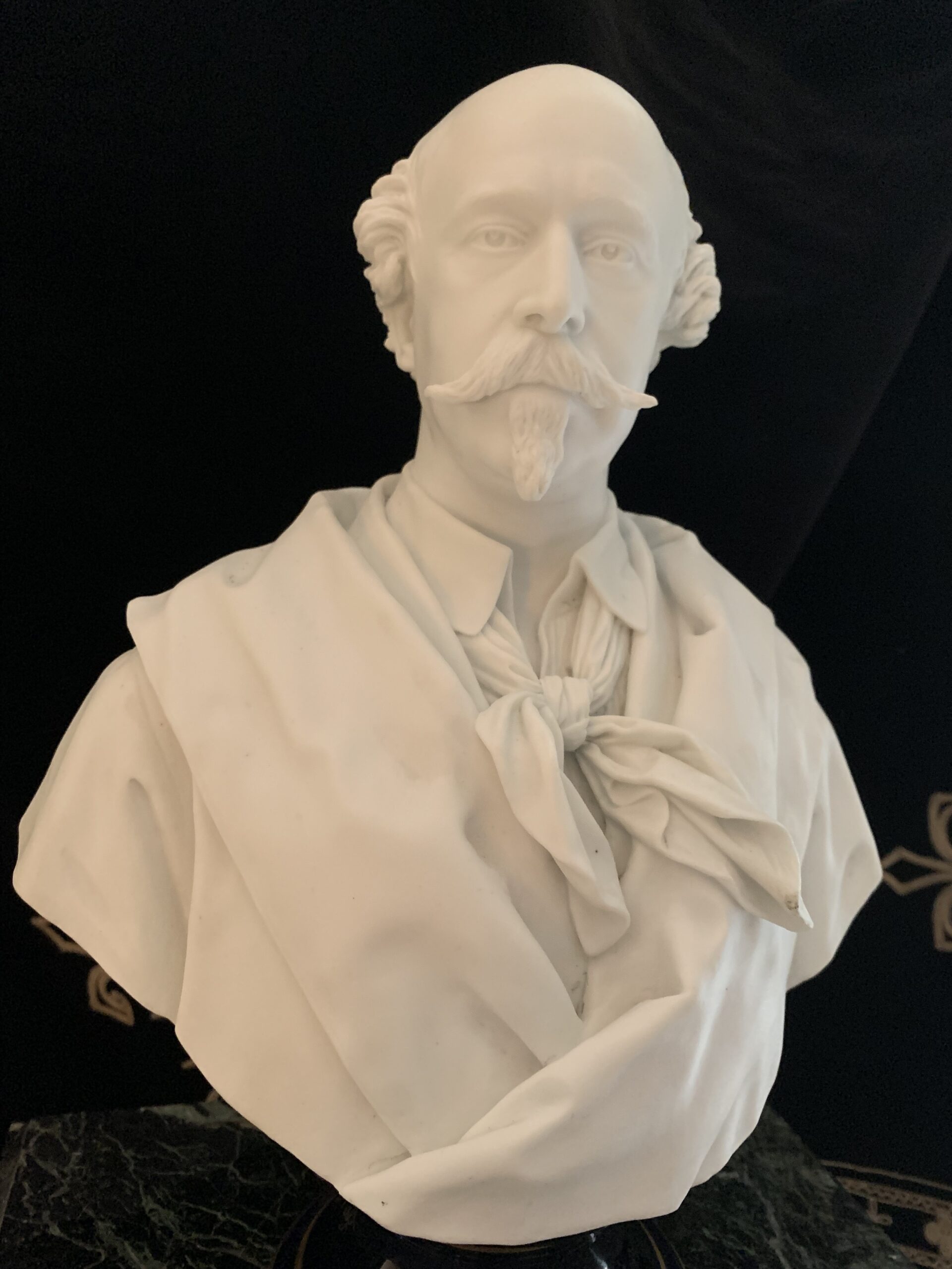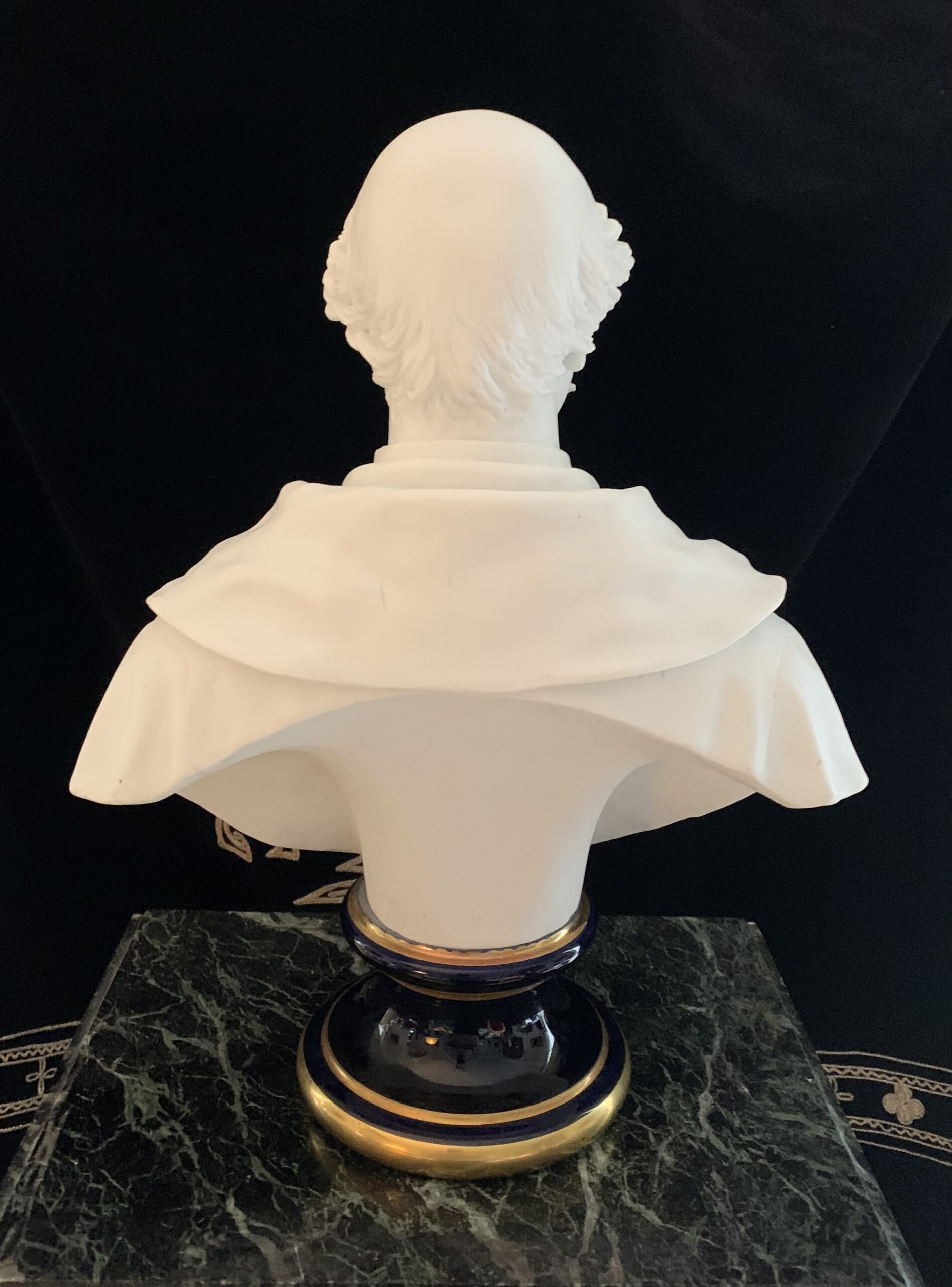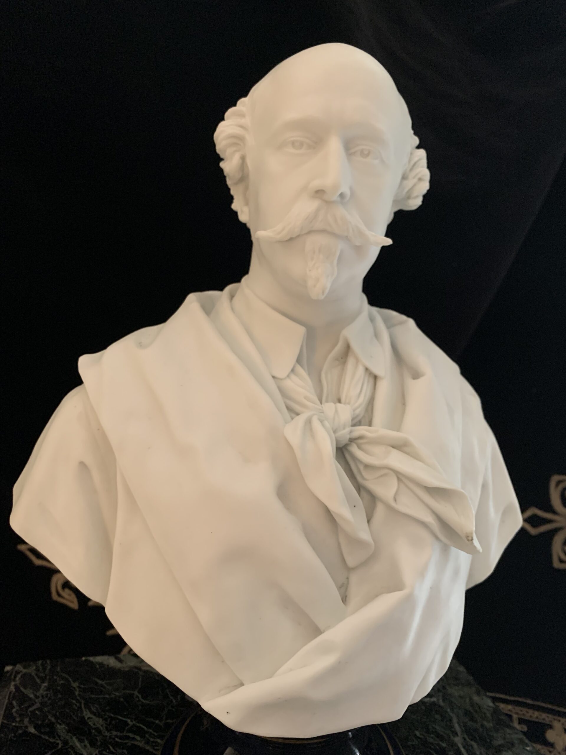 Très joli buste, en biscuit de porcelaine sur piédouche émaillé bleu représentant le Duc de Morny signé « Iselin 1865 ». Probable travail de la Manufacture de Sèvres portant sur le piédouche la marque «gille jne fabt» Marque en creux et pastille en biscuit bleu ciel monogrammé «JC»