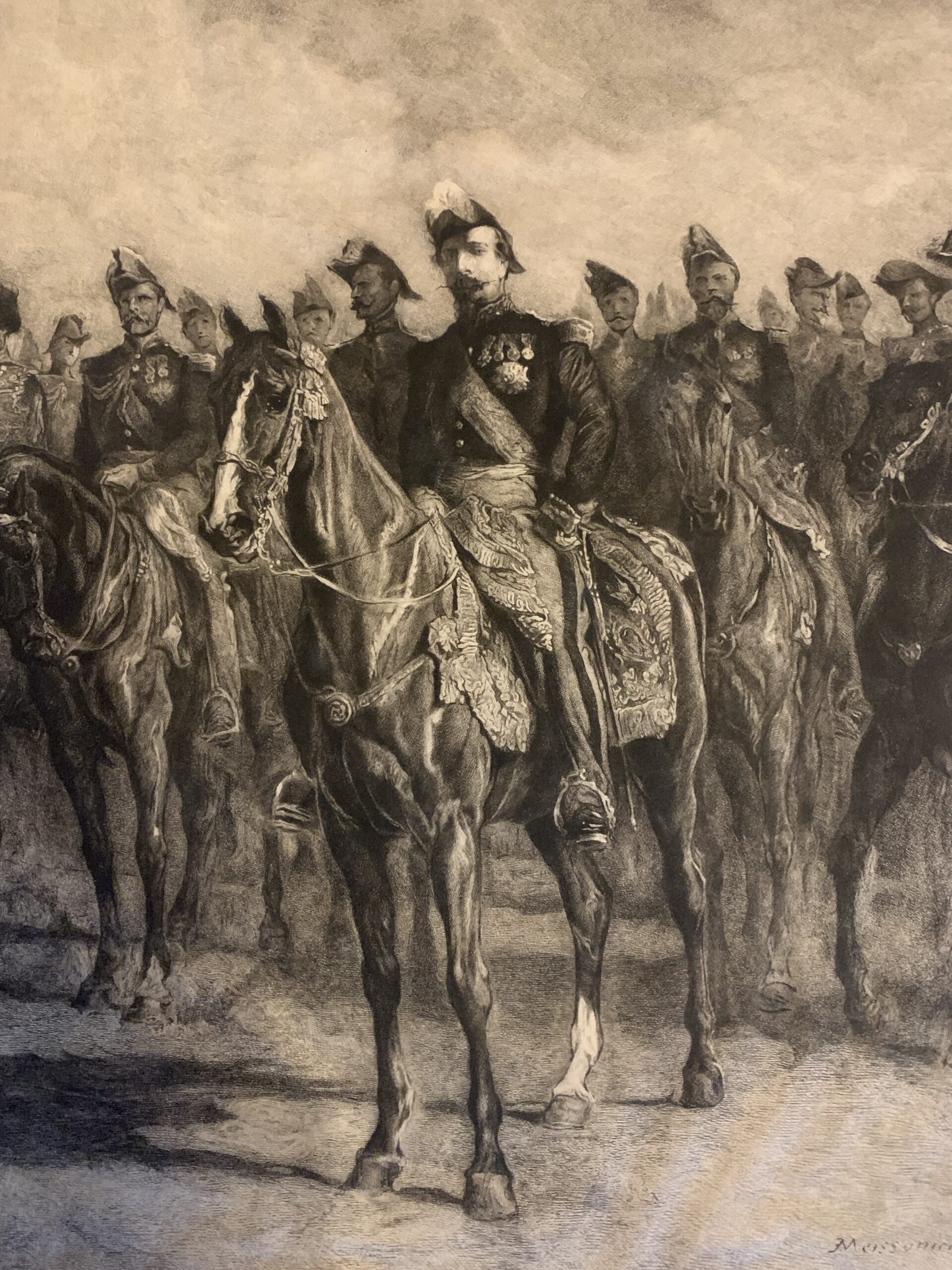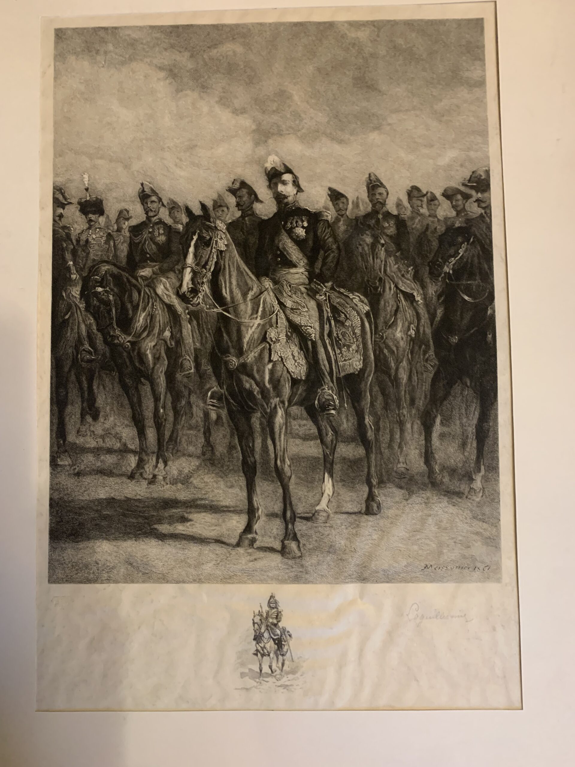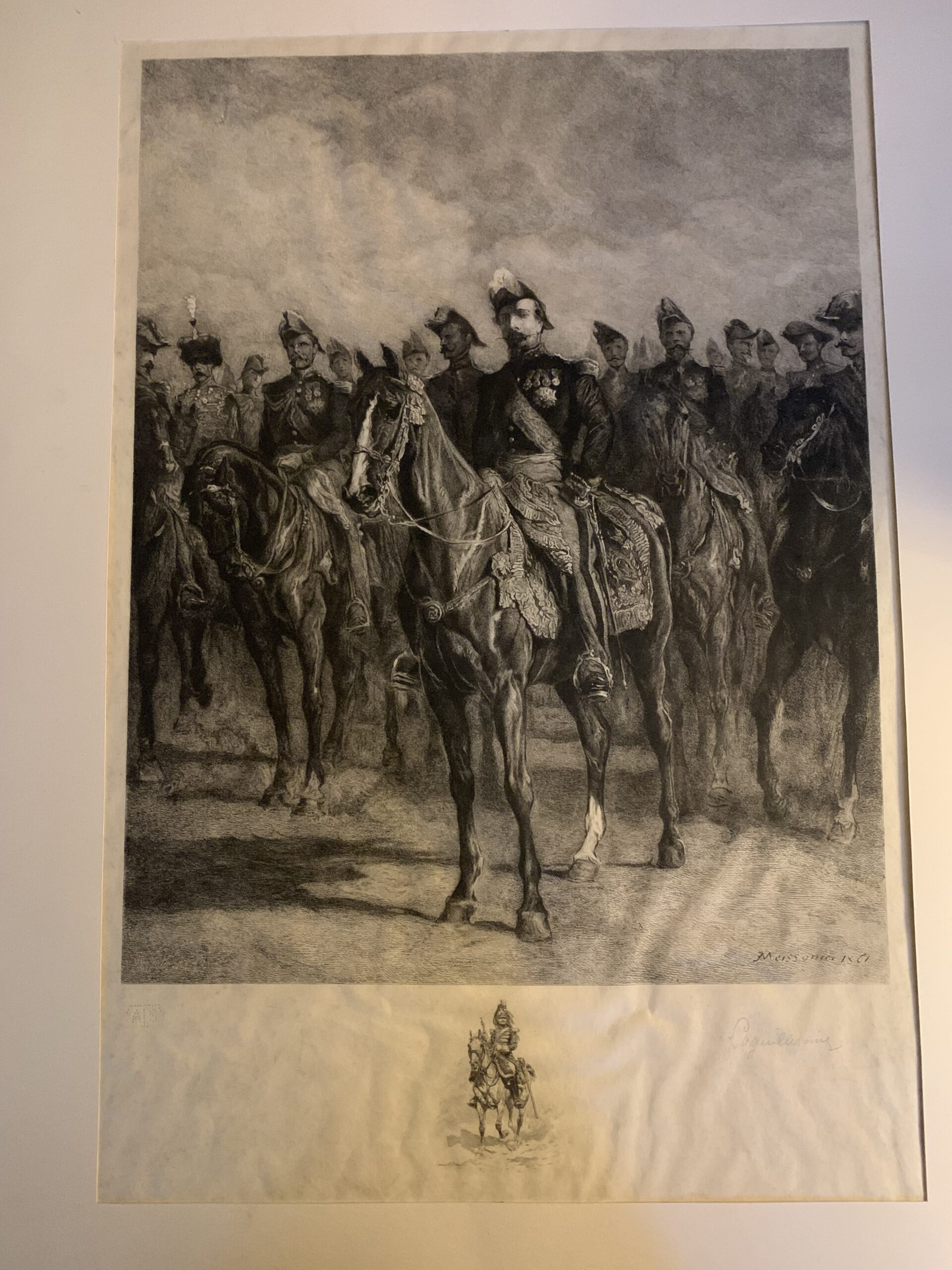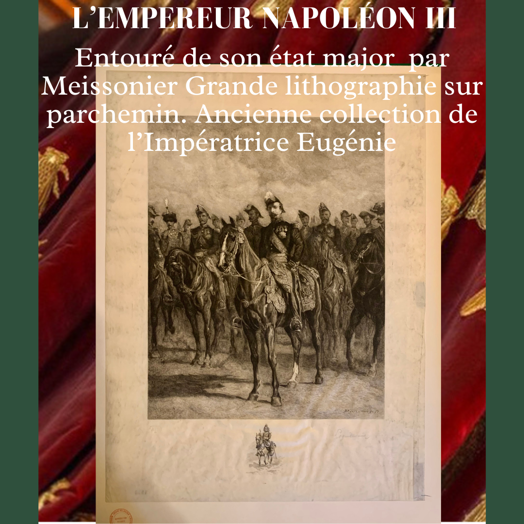 Grande et belle gravure sur parchemin représentant l’Empereur Napoléon III à cheval entouré de son état major, d’après le tableau de Ernest MEISSONIER (1815-1891) – graveur Frédéric Auguste Laguillermie (1841-1934) – Épreuve avec la signature manuscrite de Laguillermie.