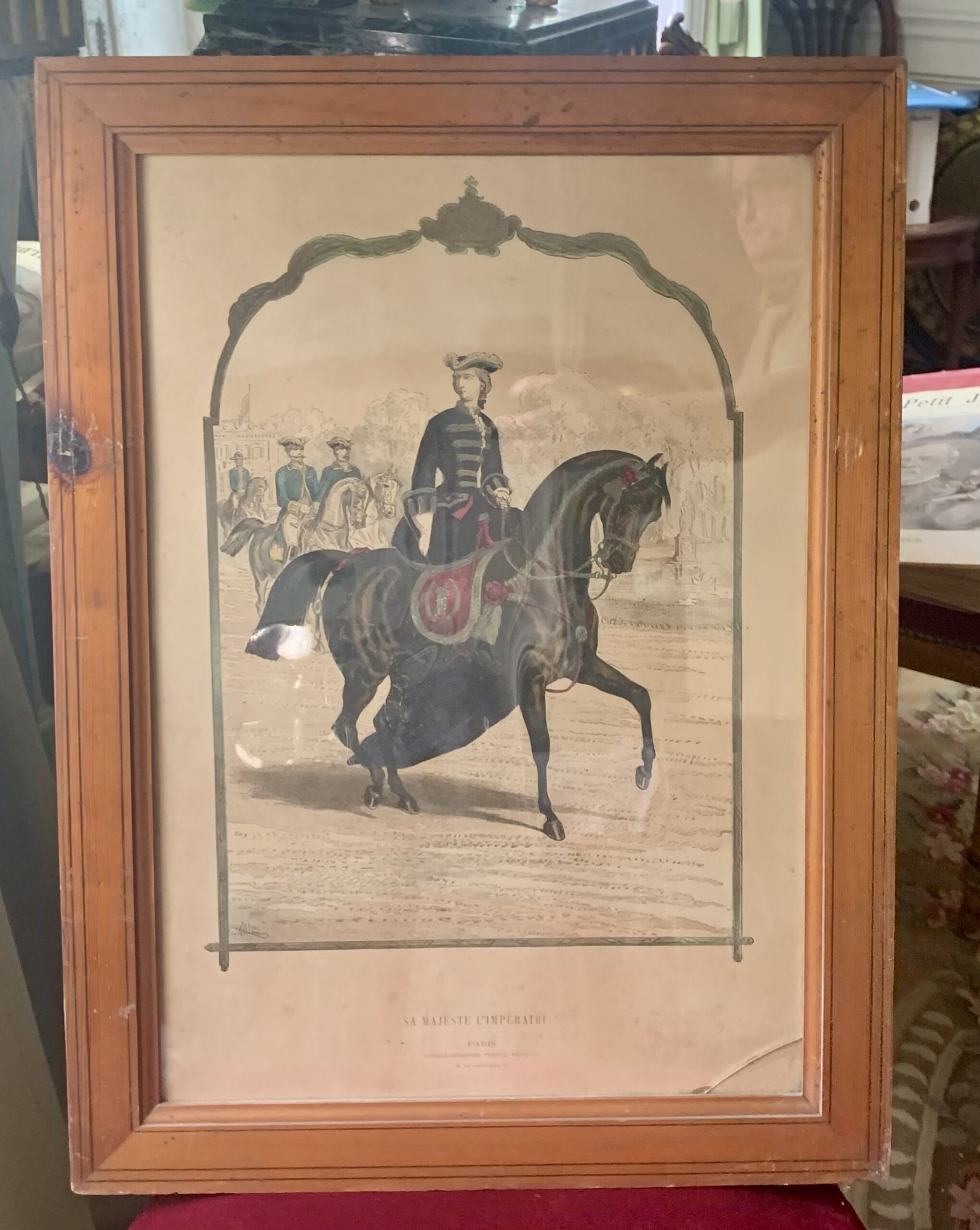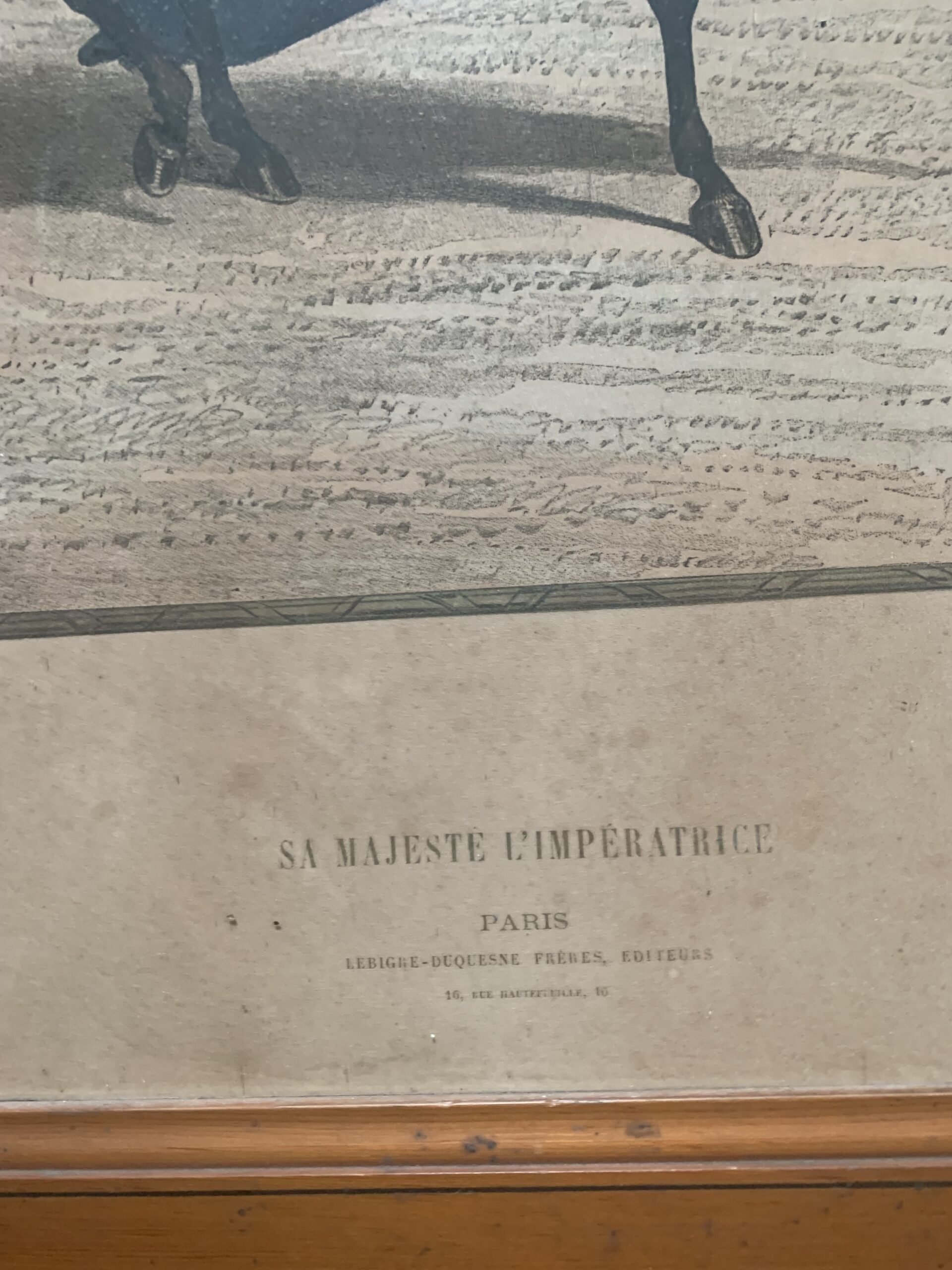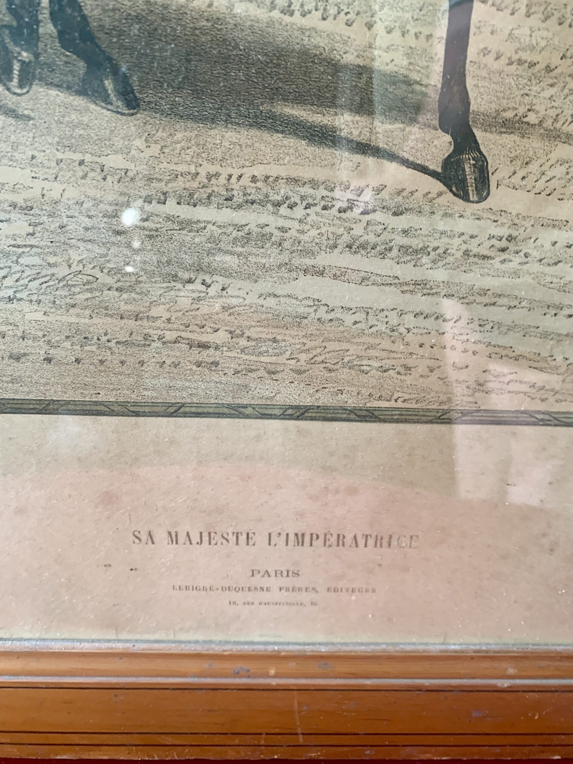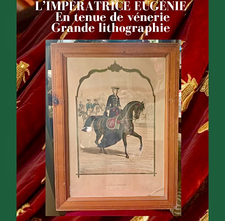 Sortie de grenier ; Grande lithographie rehaussée en couleurs de l’Impératrice Eugénie à cheval montant en amazone et en tenue de vénerie de Victor Adam (1801-1866), dans un cadre en pichepin d’époque Second Empire. Éditeurs LEBIGRE-DUQUESNE FRÈRES 16 rue Hautefeuille à Paris au dos étiquette de l’encadreur : CAUDIN A LYON.