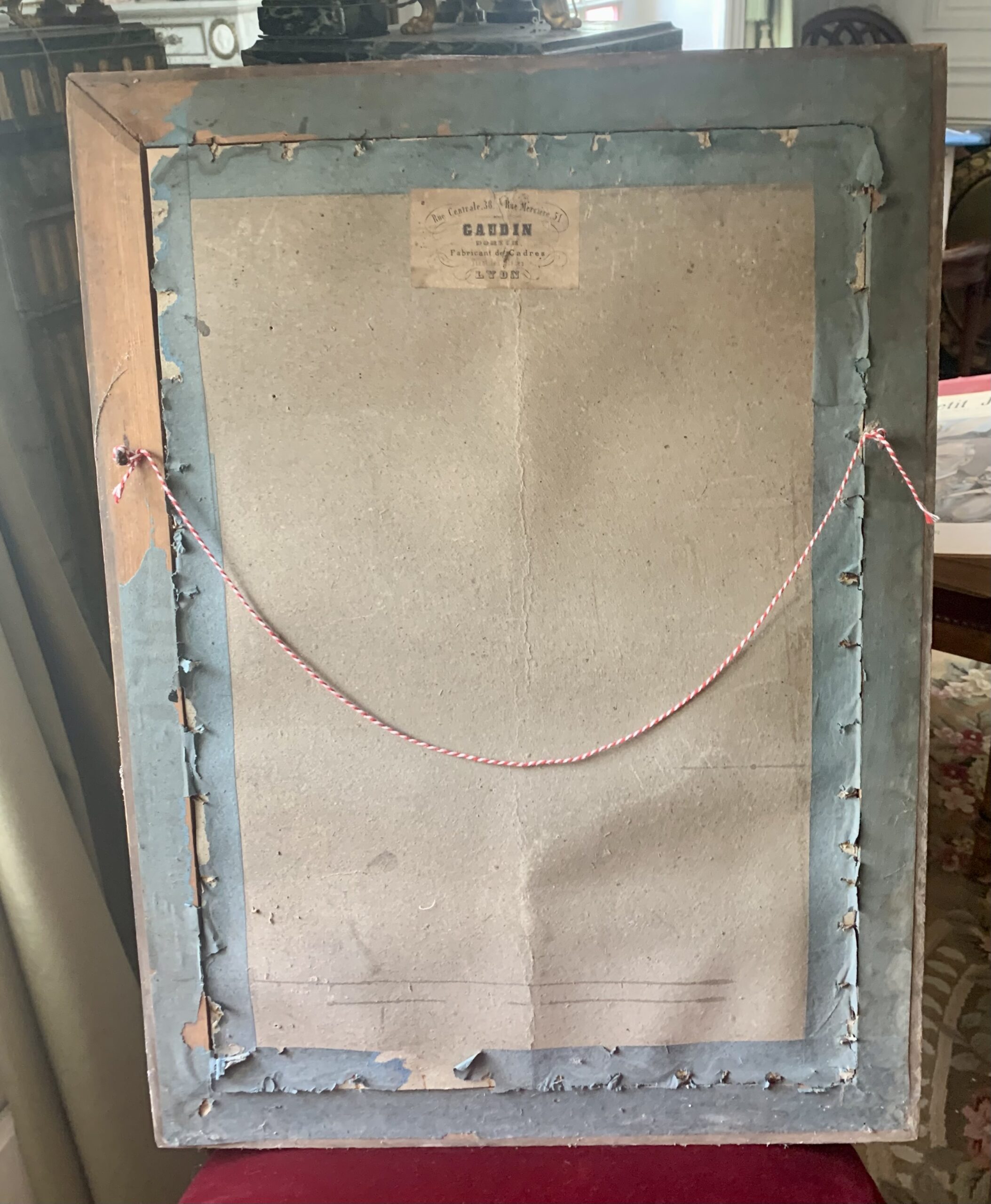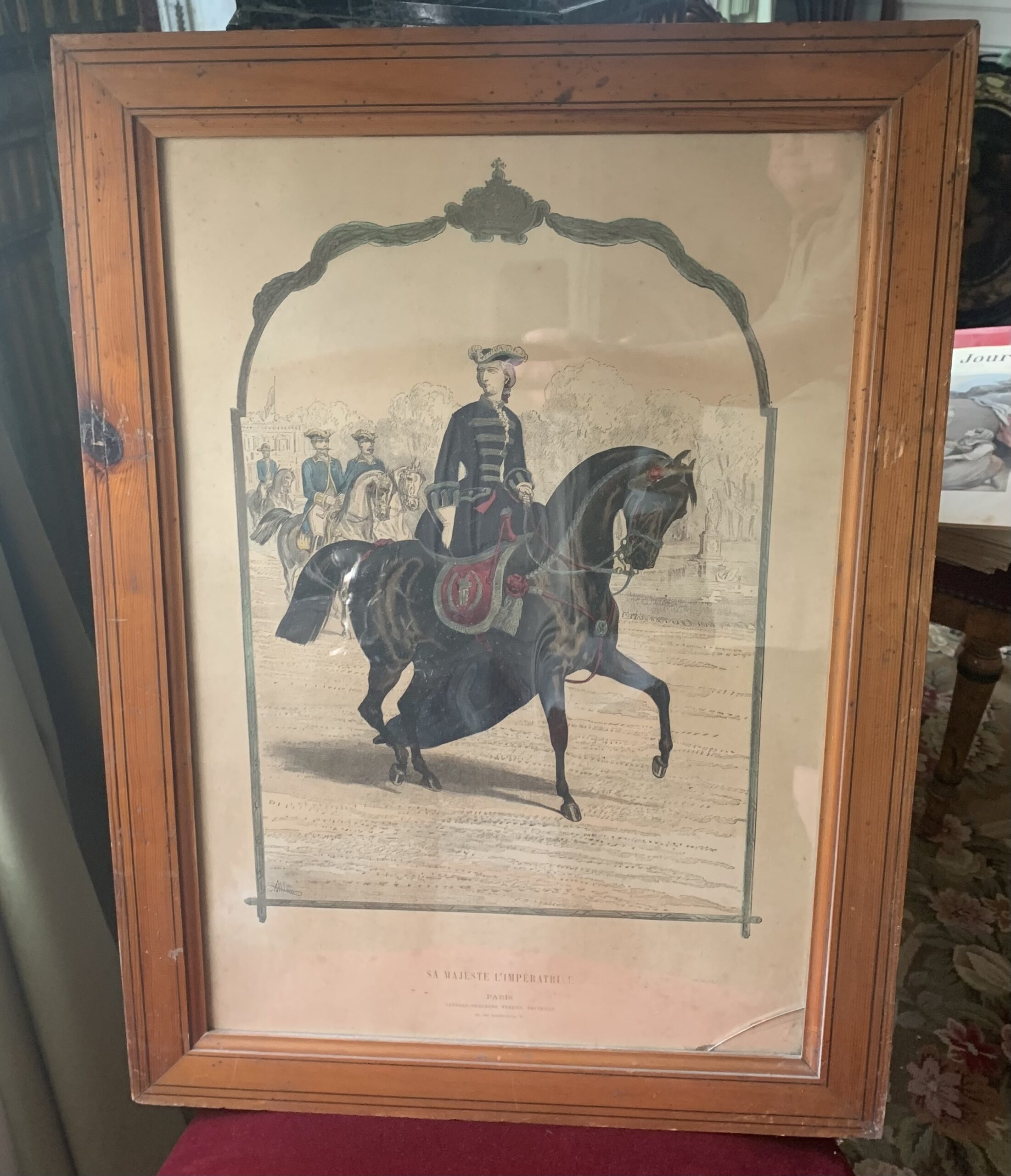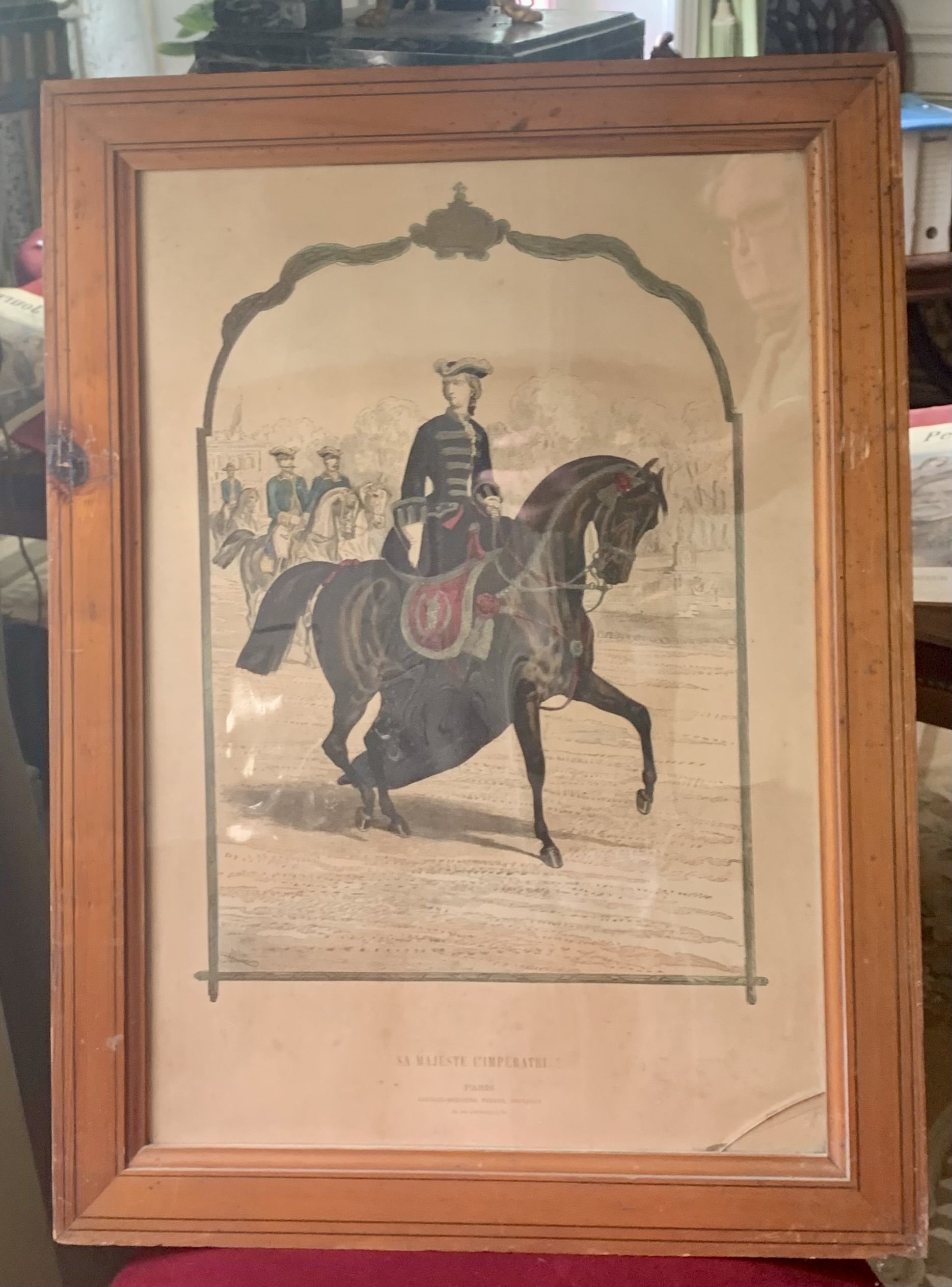 Sortie de grenier ; Grande lithographie rehaussée en couleurs de l’Impératrice Eugénie à cheval montant en amazone et en tenue de vénerie de Victor Adam (1801-1866), dans un cadre en pichepin d’époque Second Empire. Éditeurs LEBIGRE-DUQUESNE FRÈRES 16 rue Hautefeuille à Paris au dos étiquette de l’encadreur : CAUDIN A LYON.