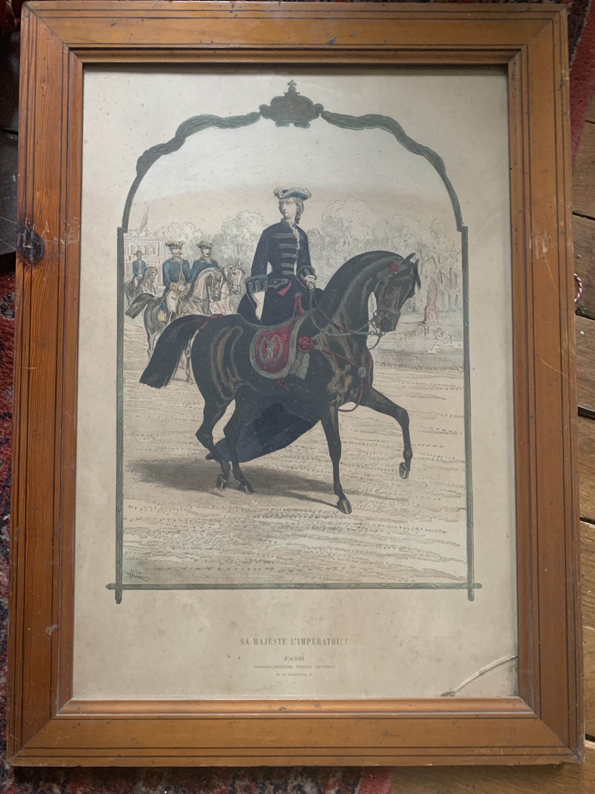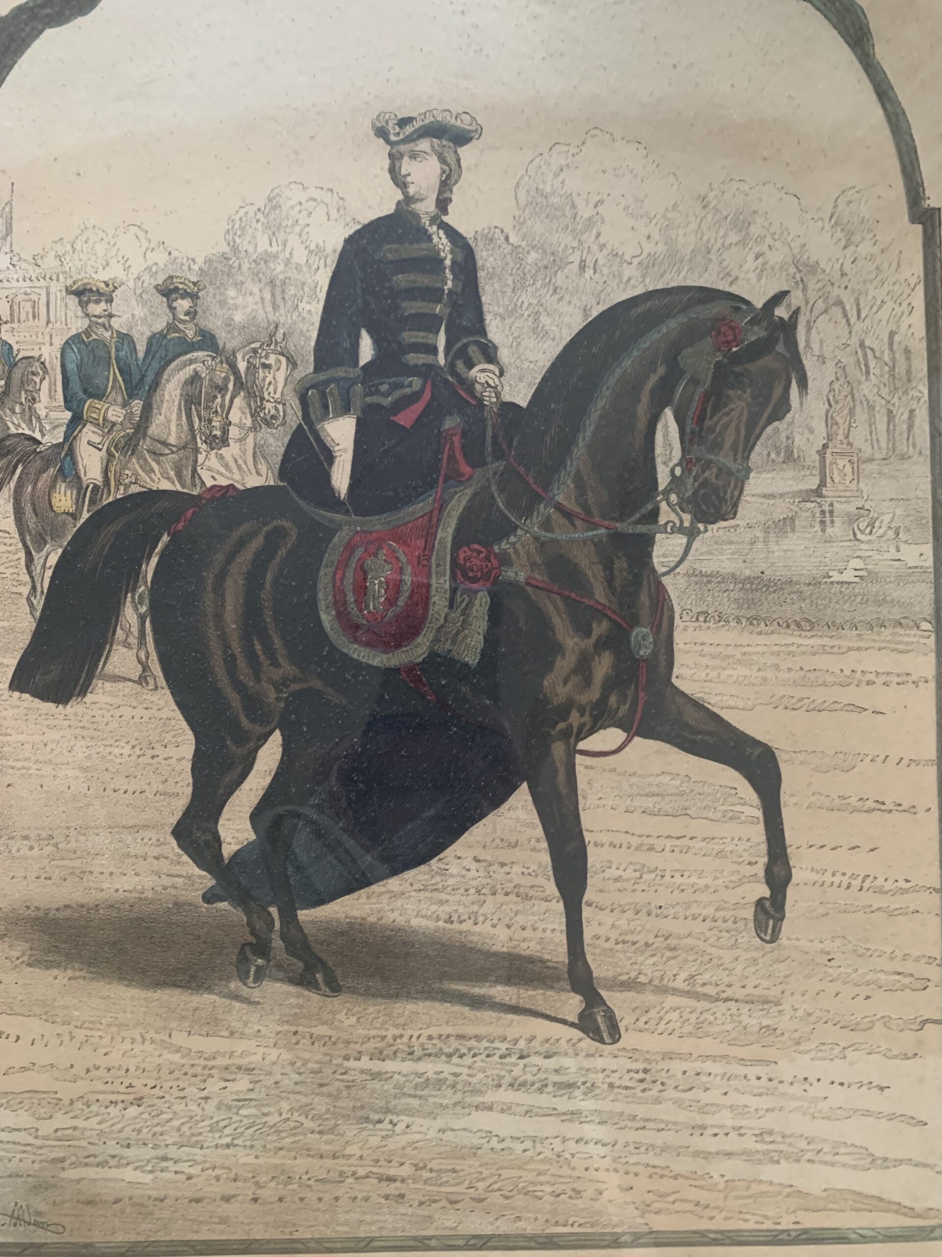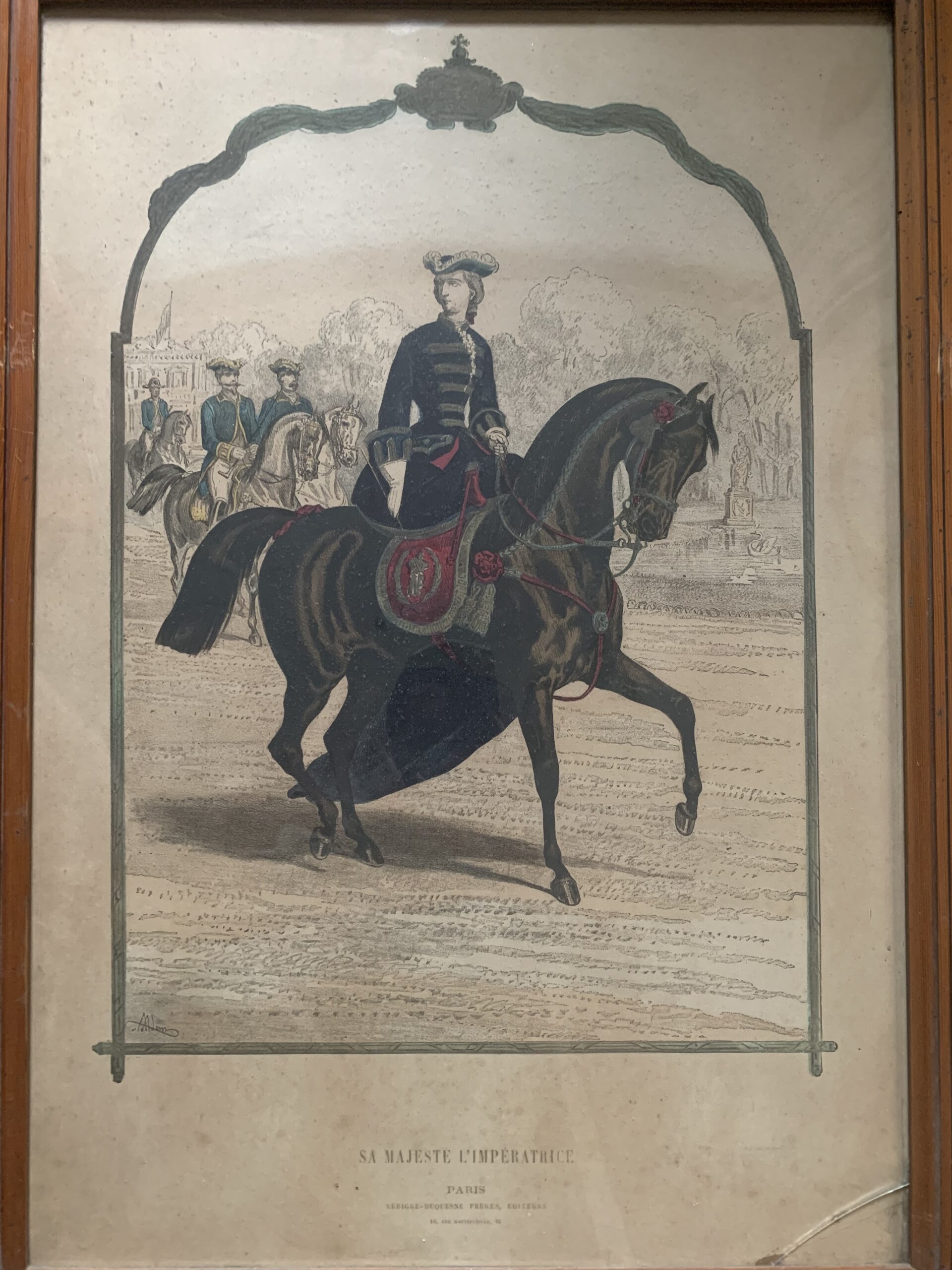 L’Impératrice Eugénie en tenue de vénerie à cheval en amazone lithographie réhaussée encadrée