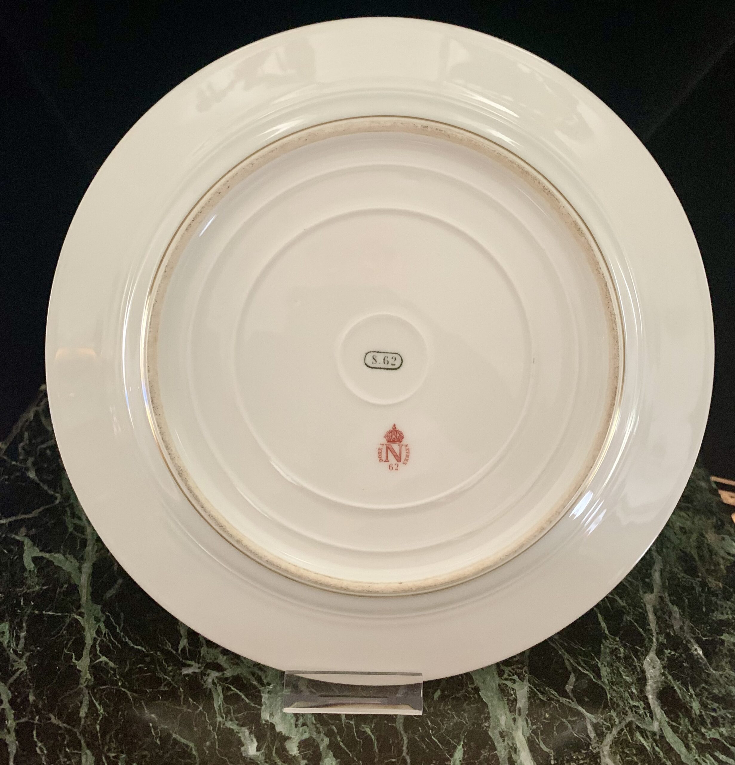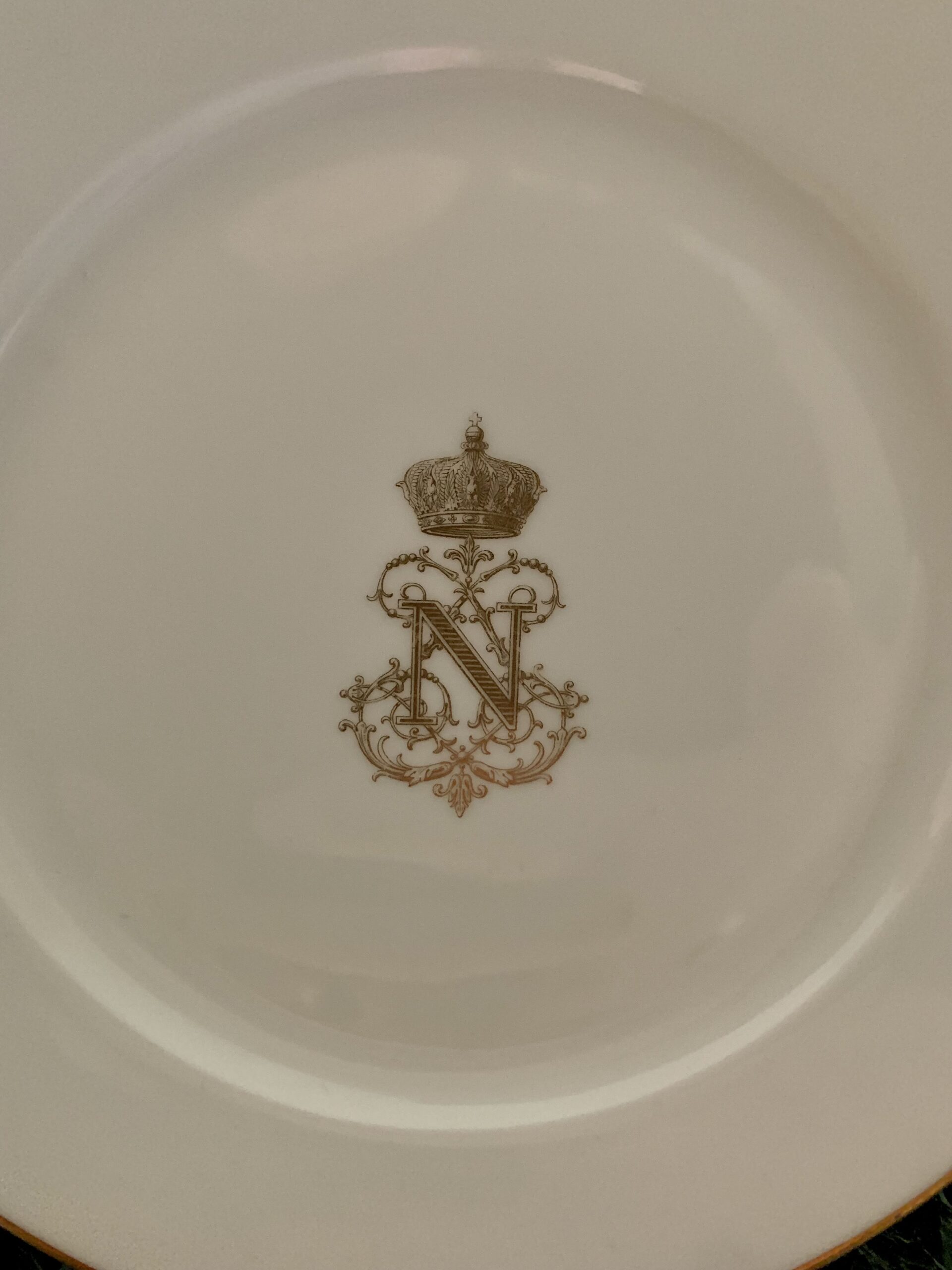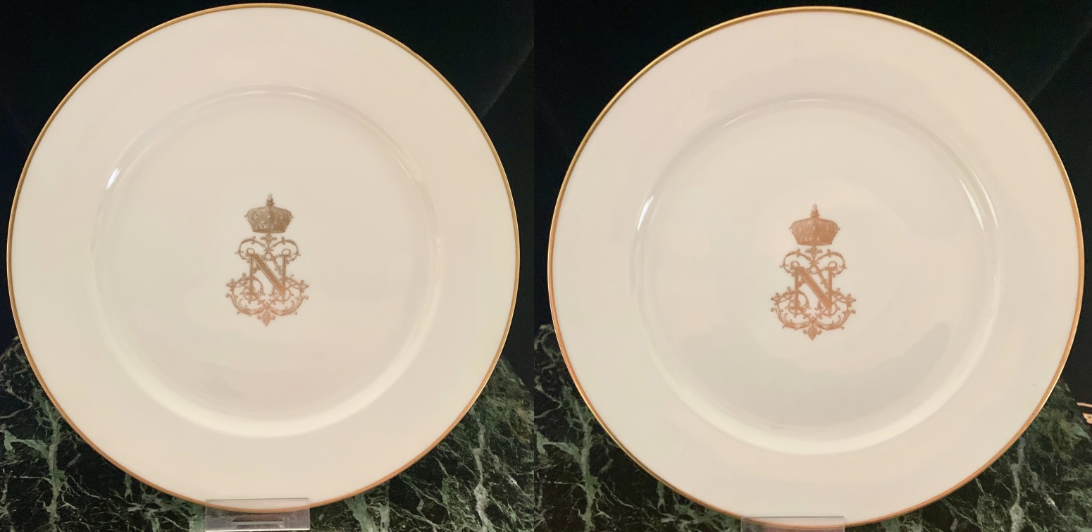 Paire d’assiettes plate à dessert – Ø : 19,5 cm, à filets et chiffre au «N» sous couronne impériale dorés.